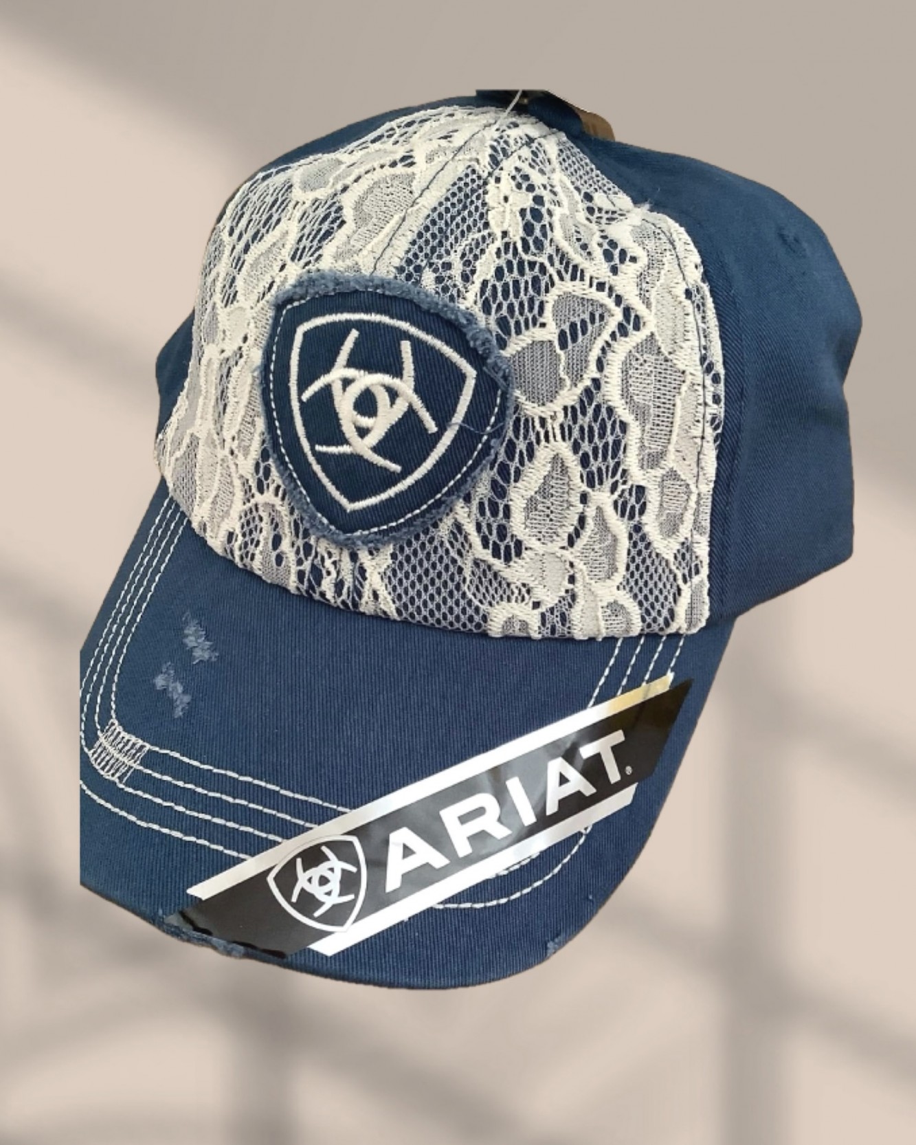 Leichte Cap mit Spitze und gesticktem Ariat-Hufeisen-Logo auf dem oberen Rand. Das Ariat-Logo ist zusätzlich auf der Rückseite über dem Klettverschluss gestickt.